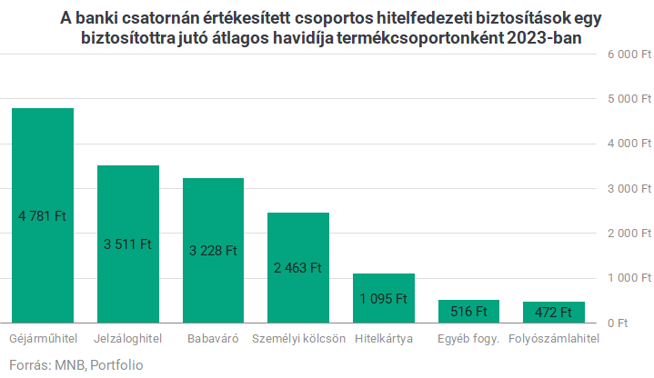 A hitelfedezeti biztosítások jellemzője, hogy halál vagy rokkantság esetén a fennálló tartozást rendezik, míg keresőképtelenség vagy munkanélküliség esetén átvállalják a havi hiteltörlesztést néhány hónapra. A piac zárt, vagyis a legtöbb esetben egy bank egyetlen biztosító termékét kínálja a hitel mellé, így korlátozott az ügyfelek választási lehetősége. Az MNB jelentése alapján 2023-ban a biztosítási piac összes díjbevételének az 1,8%-át adták ezek a biztosítások, ami akkor több mint 27 milliárd forintot jelentett egy évben, és a termékek átlagos díja 500 Ft és 4700 Ft között változott (lásd második ábránkat) Kérdésünkre az MNB azt közölte, hogy